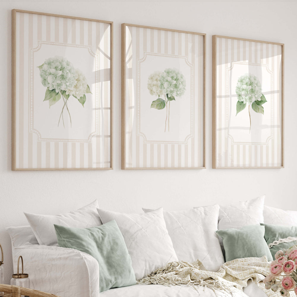 Add timeless elegance to your home with this set of 6 white hydrangea wall art printables. Featuring delicate watercolor hydrangeas framed with beige stripes, this artwork brings a fresh, calming botanical touch to any interior.