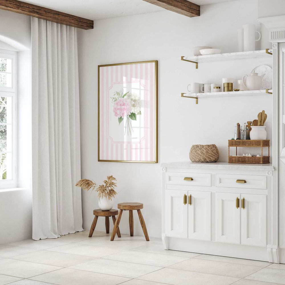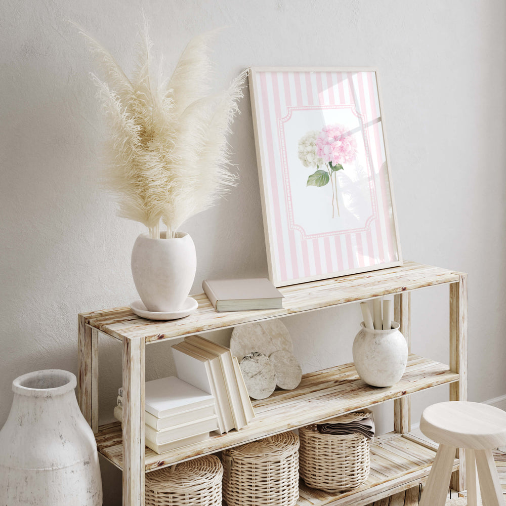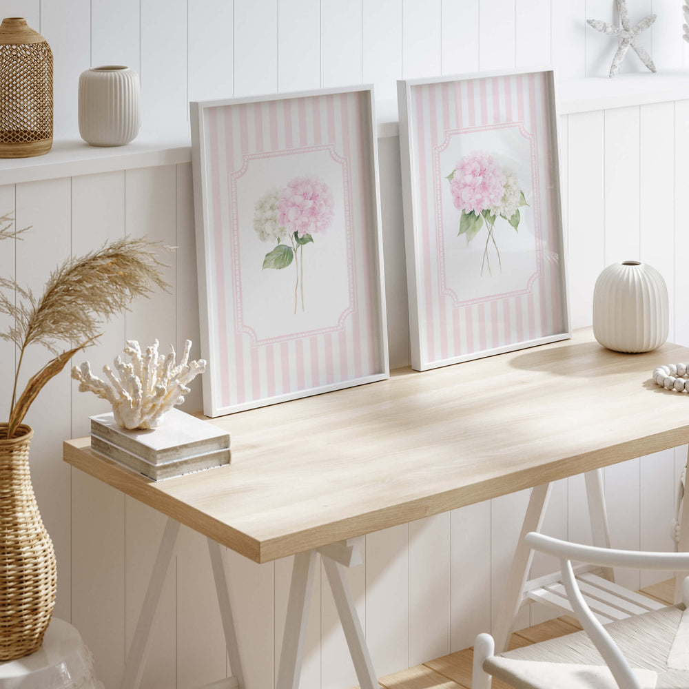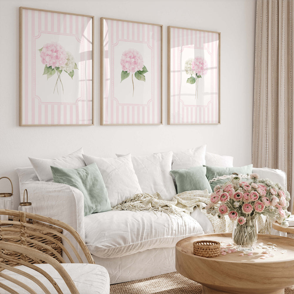 Bring elegance and charm to your home with this Pink Striped Hydrangea Wall Art Set of 6. Featuring delicate watercolor hydrangea flowers framed with soft pink stripes, this digital download is perfect for adding a feminine botanical touch to your walls. The set includes six high-quality printable floral designs that can be styled as a gallery wall in your nursery, bedroom, or living room.