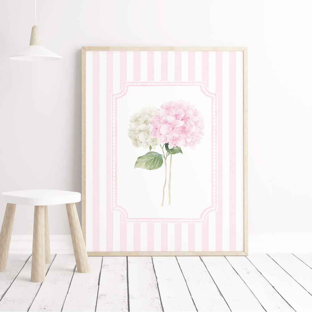 Pink Hydrangea Wall Art Set of 6 Prints Digital Download Pink Striped Nursery Decor Botanical Floral Print